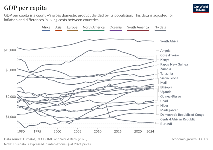 “Data Page: GDP per capita”, part of the following publication: Max Roser, Bertha Rohenkohl, Pablo Arriagada, Joe Hasell, Hannah Ritchie, and Esteban Ortiz-Ospina (2023) - “Economic Growth”. Data adapted from Data compiled from multiple sources by World Bank. Retrieved from https://enhance-improve-who-empower.owid.pages.dev/grapher/gdp-per-capita-worldbank [online resource]How to cite this data