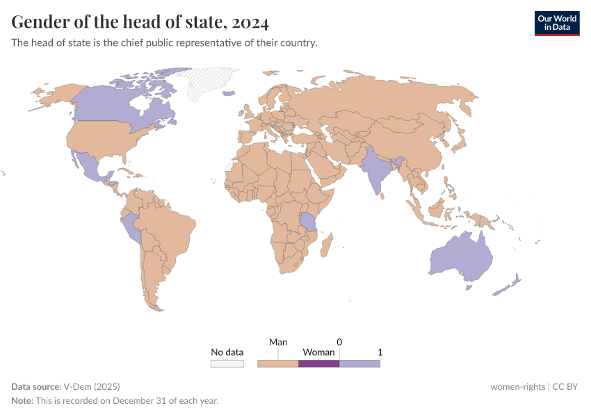 V-Dem (2025) – processed by Our World in Data. “Gender of the head of state” [dataset]. V-Dem, “Democracy report v15” [original data]. Retrieved May 8, 2025 from https://enhance-improve-who-empower.owid.pages.dev/grapher/gender-of-the-head-of-state
