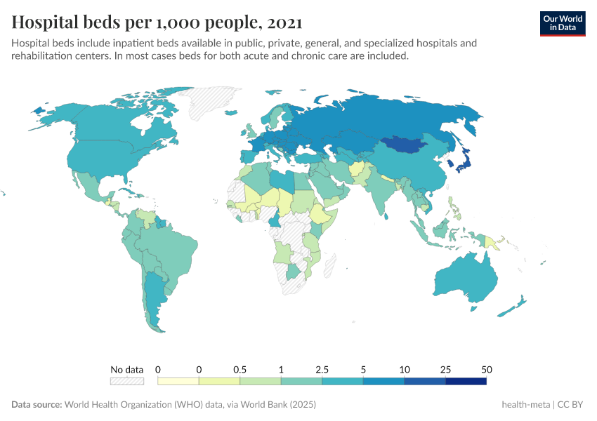 “Data Page: Hospital beds per 1,000 people”. Our World in Data (2025). Data adapted from Data compiled from multiple sources by World Bank. Retrieved from https://enhance-improve-who-empower.owid.pages.dev/grapher/hospital-beds-per-1000-people [online resource]How to cite this data