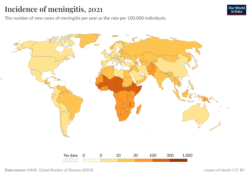 “Data Page: Incidence of meningitis”, part of the following publication: Esteban Ortiz-Ospina and Max Roser (2016) - “Global Health”. Data adapted from IHME, Global Burden of Disease. Retrieved from https://enhance-improve-who-empower.owid.pages.dev/grapher/incidence-of-meningitis [online resource]How to cite this data