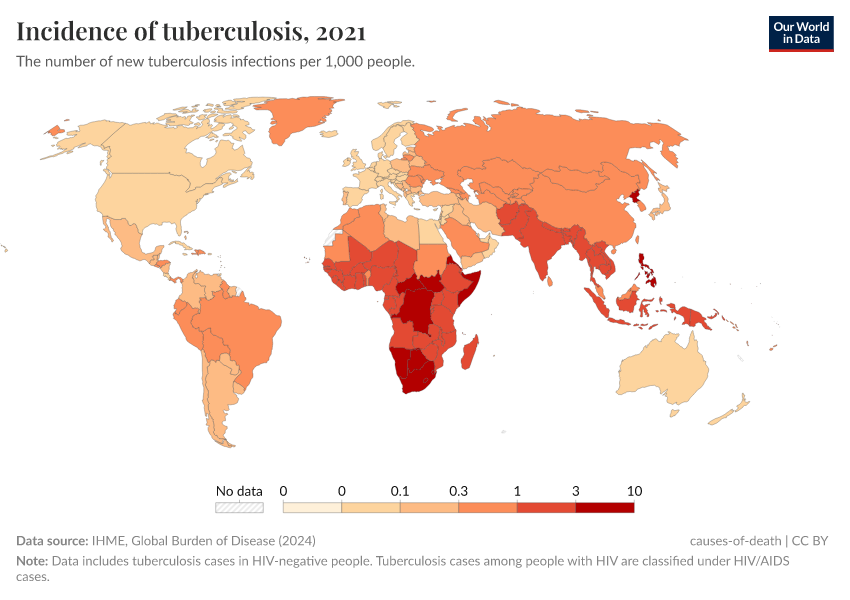 IHME, Global Burden of Disease (2024) – with major processing by Our World in Data. “Incidence of tuberculosis” [dataset]. IHME, Global Burden of Disease, “Global Burden of Disease - Prevalence and Incidence” [original data]. Retrieved May 8, 2025 from https://enhance-improve-who-empower.owid.pages.dev/grapher/incidence-of-tuberculosis