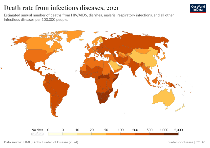 IHME, Global Burden of Disease (2024) – with minor processing by Our World in Data. “Death rate from infectious diseases” [dataset]. IHME, Global Burden of Disease, “Global Burden of Disease - Deaths and DALYs” [original data]. Retrieved May 8, 2025 from https://enhance-improve-who-empower.owid.pages.dev/grapher/infectious-disease-death-rates-gbd