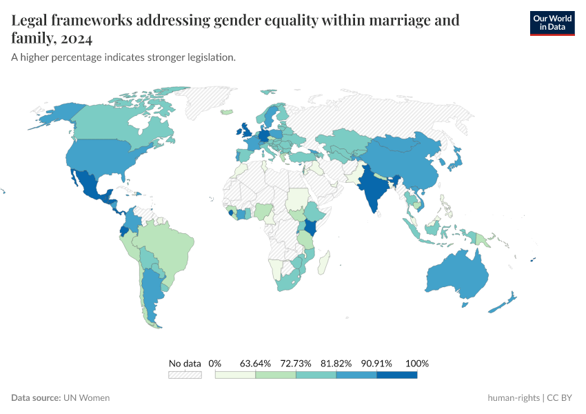 UN Women – processed by Our World in Data. “Legal frameworks addressing gender equality within marriage and family” [dataset]. UN Women, “UN Women” [original data]. Retrieved May 8, 2025 from https://enhance-improve-who-empower.owid.pages.dev/grapher/legal-frameworks-gender-equality-within-marriage-and-family