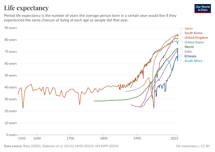 UN WPP (2024); HMD (2024); Zijdeman et al. (2015); Riley (2005) – with minor processing by Our World in Data. “Life expectancy at birth – Various sources – period tables” [dataset]. Human Mortality Database, “Human Mortality Database”; United Nations, “World Population Prospects”; Zijdeman et al., “Life Expectancy at birth 2”; James C. Riley, “Estimates of Regional and Global Life Expectancy, 1800-2001” [original data]. Retrieved May 8, 2025 from https://enhance-improve-who-empower.owid.pages.dev/grapher/life-expectancy