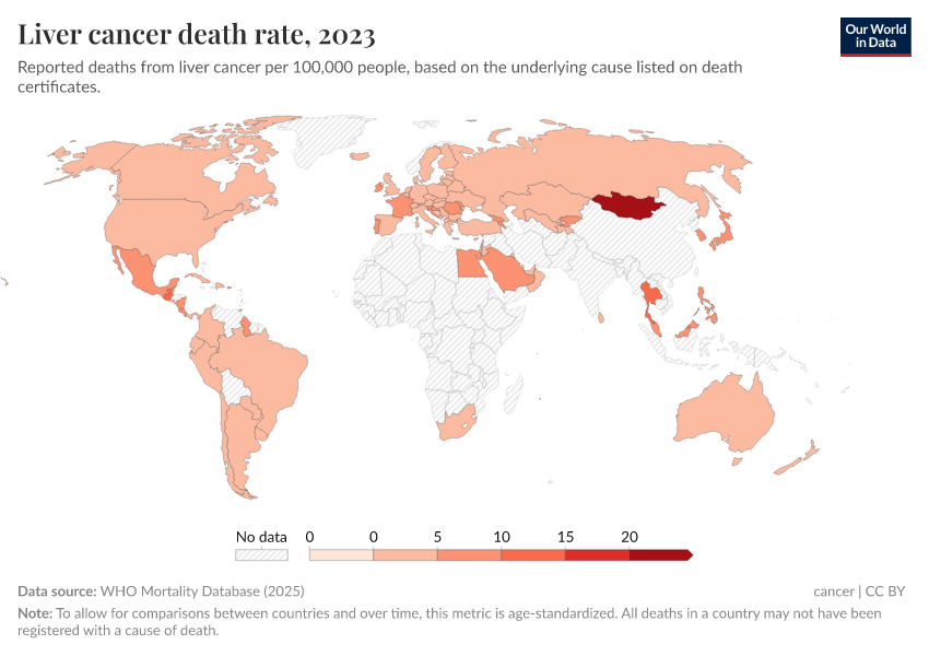 WHO Mortality Database (2024) – with minor processing by Our World in Data. “Liver cancer death rate” [dataset]. WHO Mortality Database, “WHO Mortality Database” [original data]. Retrieved May 8, 2025 from https://enhance-improve-who-empower.owid.pages.dev/grapher/liver-cancer-death-rate