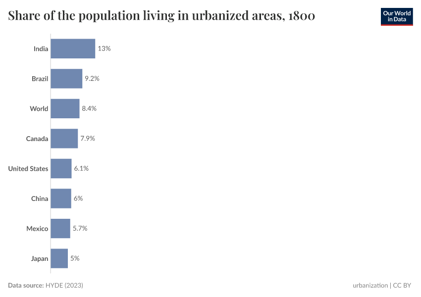 HYDE (2023) – with minor processing by Our World in Data. “Share of the population living in urbanized areas” [dataset]. PBL Netherlands Environmental Assessment Agency, “History Database of the Global Environment 3.3” [original data]. Retrieved May 8, 2025 from https://enhance-improve-who-empower.owid.pages.dev/grapher/long-term-urban-population-region
