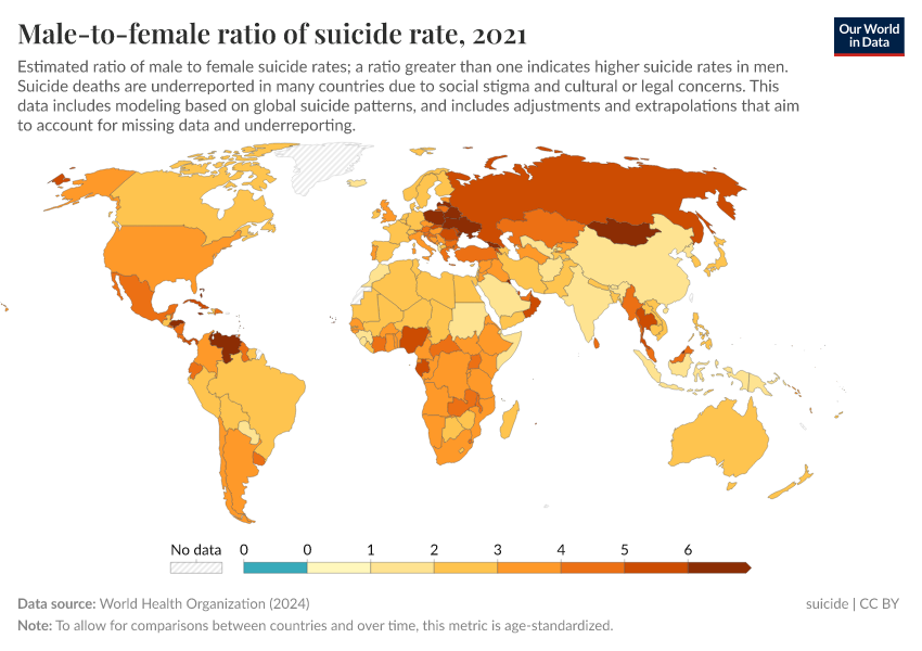 World Health Organization (2024) – with major processing by Our World in Data. “Male-to-female ratio of suicide rate” [dataset]. World Health Organization, “Global Health Estimates” [original data]. Retrieved May 8, 2025 from https://enhance-improve-who-empower.owid.pages.dev/grapher/male-female-ratio-suicides-rates
