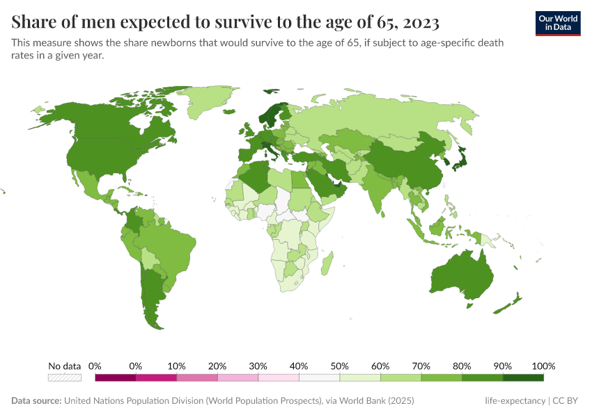 “Data Page: Share of men expected to survive to the age of 65”. Our World in Data (2025). Data adapted from UN Population Division (via World Bank). Retrieved from https://enhance-improve-who-empower.owid.pages.dev/grapher/men-survival-to-age-65 [online resource]How to cite this data