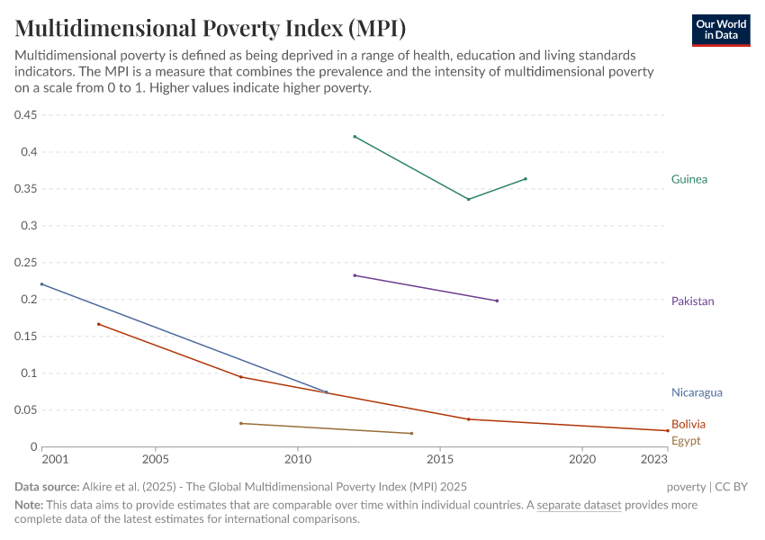 Alkire, Kanagaratnam and Suppa (2024) - The Global Multidimensional Poverty Index (MPI) 2024 – with minor processing by Our World in Data. “Multidimensional Poverty Index (MPI) – Harmonized over time” [dataset]. Alkire, Kanagaratnam and Suppa, “Global Multidimensional Poverty Index (MPI) 2024” [original data]. Retrieved May 8, 2025 from https://enhance-improve-who-empower.owid.pages.dev/grapher/multidimensional-poverty-index-mpi-hot