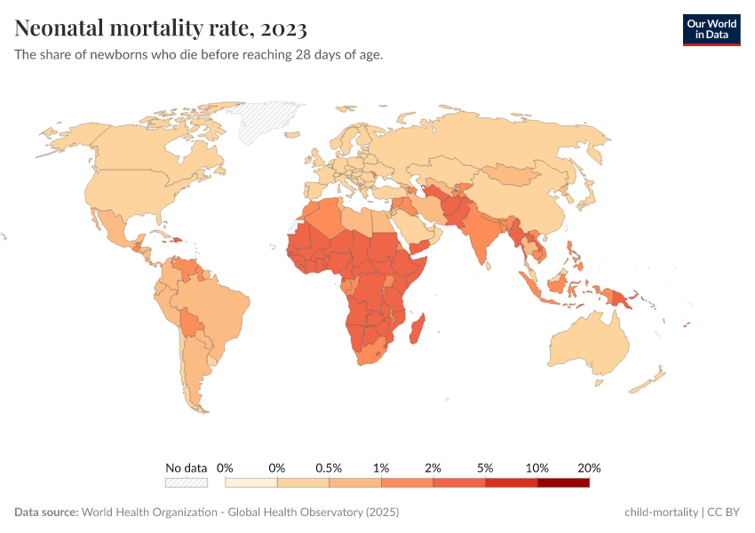 World Health Organization - Global Health Observatory (2024) – processed by Our World in Data. “Neonatal mortality rate” [dataset]. World Health Organization, “Global Health Observatory” [original data]. Retrieved May 8, 2025 from https://enhance-improve-who-empower.owid.pages.dev/grapher/neonatal-mortality-rate-gho