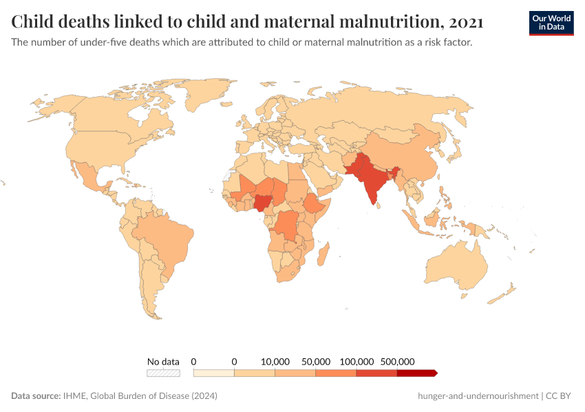 IHME, Global Burden of Disease (2024) – with minor processing by Our World in Data. “Child deaths linked to child and maternal malnutrition” [dataset]. IHME, Global Burden of Disease, “Global Burden of Disease - Risk Factors” [original data]. Retrieved May 8, 2025 from https://enhance-improve-who-empower.owid.pages.dev/grapher/number-child-deaths-malnutrition