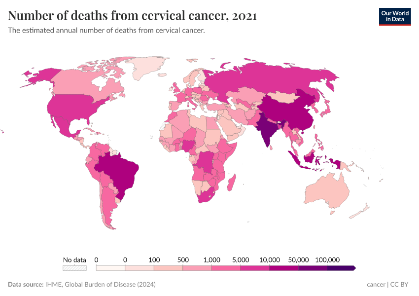 IHME, Global Burden of Disease (2024) – with minor processing by Our World in Data. “Number of deaths from cervical cancer” [dataset]. IHME, Global Burden of Disease, “Global Burden of Disease - Deaths and DALYs” [original data]. Retrieved May 8, 2025 from https://enhance-improve-who-empower.owid.pages.dev/grapher/number-of-deaths-from-cervical-cancer