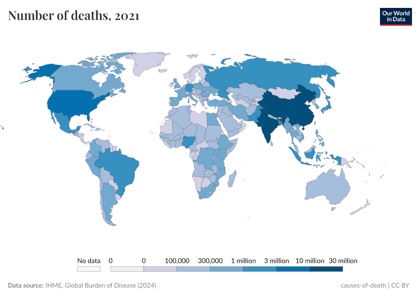 IHME, Global Burden of Disease (2024) – with minor processing by Our World in Data. “Number of deaths” [dataset]. IHME, Global Burden of Disease, “Global Burden of Disease - Deaths and DALYs” [original data]. Retrieved May 8, 2025 from https://enhance-improve-who-empower.owid.pages.dev/grapher/number-of-deaths-gbd