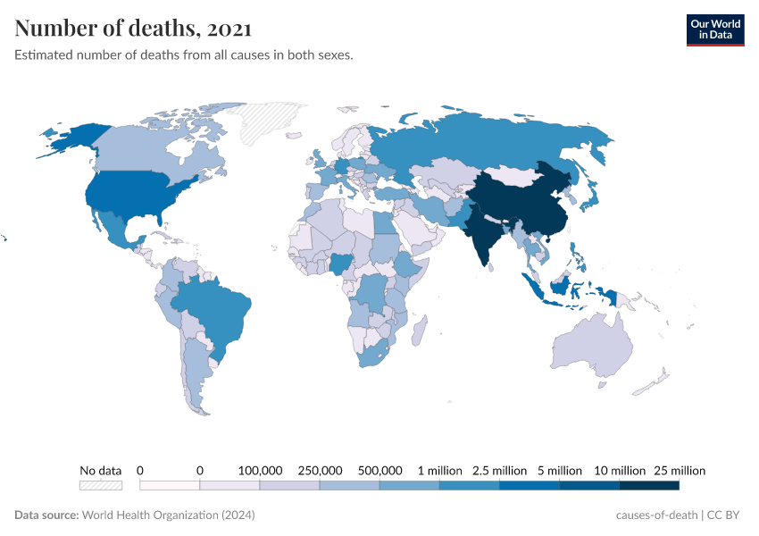 World Health Organization (2024) – with major processing by Our World in Data. “Number of deaths” [dataset]. World Health Organization, “Global Health Estimates” [original data]. Retrieved May 8, 2025 from https://enhance-improve-who-empower.owid.pages.dev/grapher/number-of-deaths-who