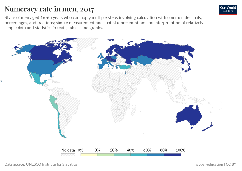 UNESCO Institute for Statistics – processed by Our World in Data. “Numeracy rate in men” [dataset]. UNESCO Institute for Statistics, “Data from multiple sources” [original data]. Retrieved May 8, 2025 from https://enhance-improve-who-empower.owid.pages.dev/grapher/numeracy-rate-in-adult-men