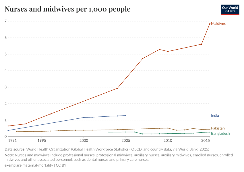 “Data Page: Nurses and midwives per 1,000 people”. Our World in Data (2025). Data adapted from Data compiled from multiple sources by World Bank. Retrieved from https://enhance-improve-who-empower.owid.pages.dev/grapher/nurses-and-midwives-per-1000-people [online resource]How to cite this data