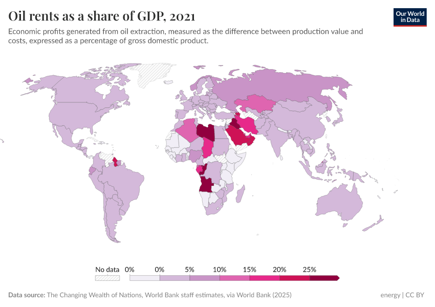 World Bank based on data from multiple sources (2025) – processed by Our World in Data. “Oil rents as a share of GDP” [dataset]. World Bank based on data from multiple sources, “World Development Indicators” [original data]. Retrieved May 8, 2025 from https://enhance-improve-who-empower.owid.pages.dev/grapher/oil-rents-as-a-share-of-gdp