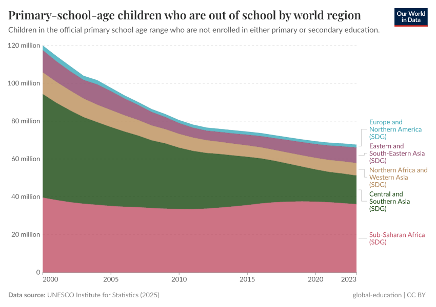 “Data Page: Primary-school-age children who are out of school by world region”. Our World in Data (2025). Data adapted from UNESCO Institute for Statistics. Retrieved from https://enhance-improve-who-empower.owid.pages.dev/grapher/out-of-school-children-of-primary-school-age-by-world-region [online resource]How to cite this data