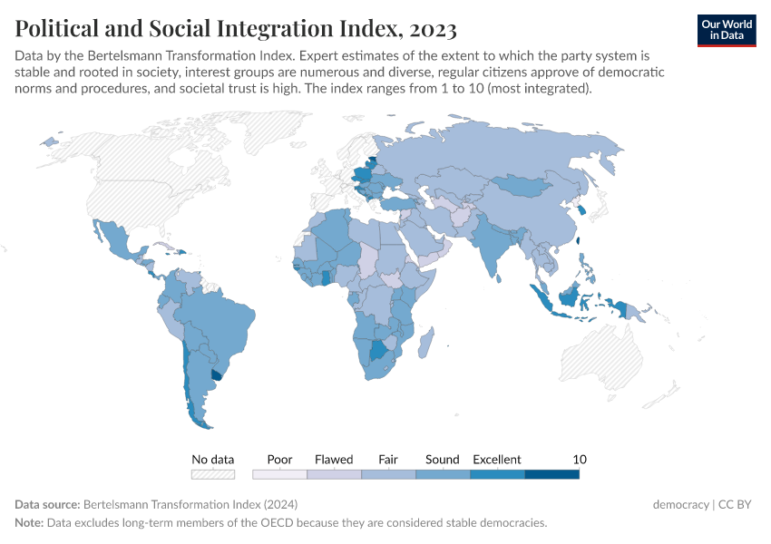 “Data Page: Political and social integration index”, part of the following publication: Bastian Herre, Lucas Rodés-Guirao, and Esteban Ortiz-Ospina (2013) - “Democracy”. Data adapted from Bertelsmann Transformation Index. Retrieved from https://enhance-improve-who-empower.owid.pages.dev/grapher/political-social-integration-index-bti [online resource]How to cite this data