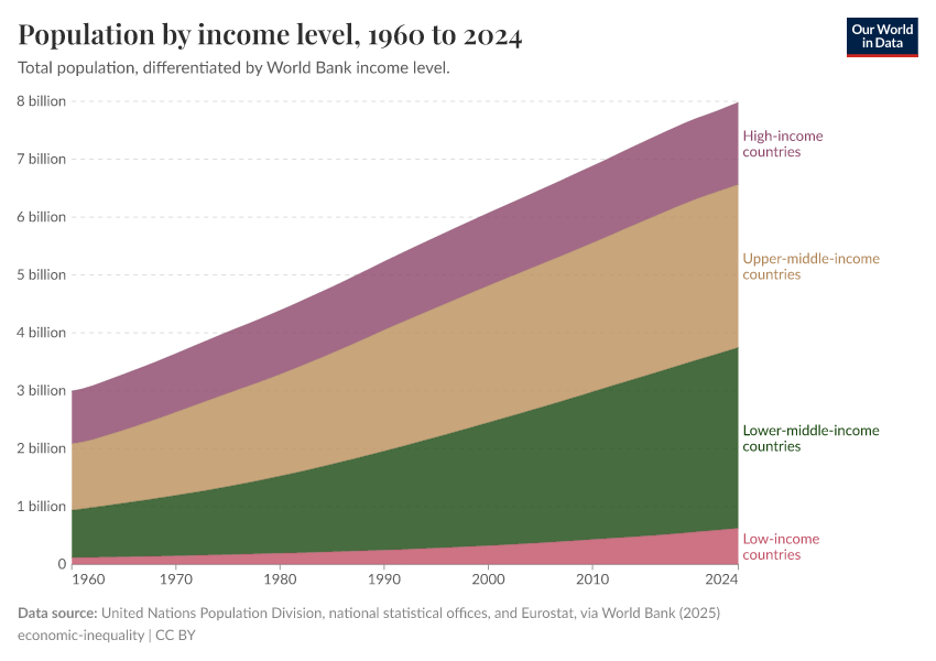 United Nations Population Division, Eurostat, and National Statistical Offices (2025) – processed by Our World in Data. “Population by income level” [dataset]. United Nations Population Division, Eurostat, and National Statistical Offices, “World Development Indicators” [original data]. Retrieved May 8, 2025 from https://enhance-improve-who-empower.owid.pages.dev/grapher/population-by-income-level
