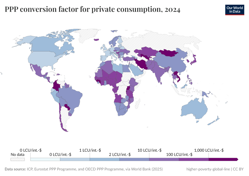 “Data Page: PPP conversion factor for private consumption”. Our World in Data (2025). Data adapted from Data compiled from multiple sources by World Bank. Retrieved from https://enhance-improve-who-empower.owid.pages.dev/grapher/ppp-conversion-factor-for-private-consumption [online resource]How to cite this data