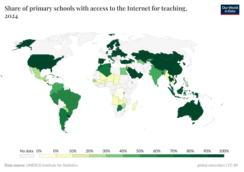 UNESCO Institute for Statistics – processed by Our World in Data. “Share of primary schools with access to the Internet for teaching” [dataset]. UNESCO Institute for Statistics, “Data from multiple sources” [original data]. Retrieved May 8, 2025 from https://enhance-improve-who-empower.owid.pages.dev/grapher/primary-schools-with-access-to-internet