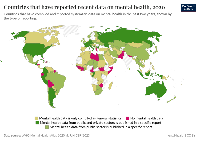 WHO Mental Health Atlas 2020 via UNICEF (2023) – with major processing by Our World in Data. “Countries that have reported recent data on mental health” [dataset]. WHO Mental Health Atlas 2020 via UNICEF, “Countdown for Global Mental Health 2030” [original data]. Retrieved May 8, 2025 from https://enhance-improve-who-empower.owid.pages.dev/grapher/reporting-of-mental-health-system-data-in-the-past-two-years