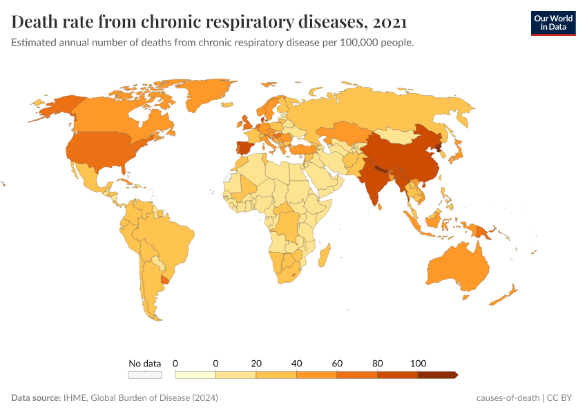 IHME, Global Burden of Disease (2024) – with minor processing by Our World in Data. “Death rate from chronic respiratory diseases” [dataset]. IHME, Global Burden of Disease, “Global Burden of Disease - Deaths and DALYs” [original data]. Retrieved May 8, 2025 from https://enhance-improve-who-empower.owid.pages.dev/grapher/respiratory-disease-death-rate-gbd