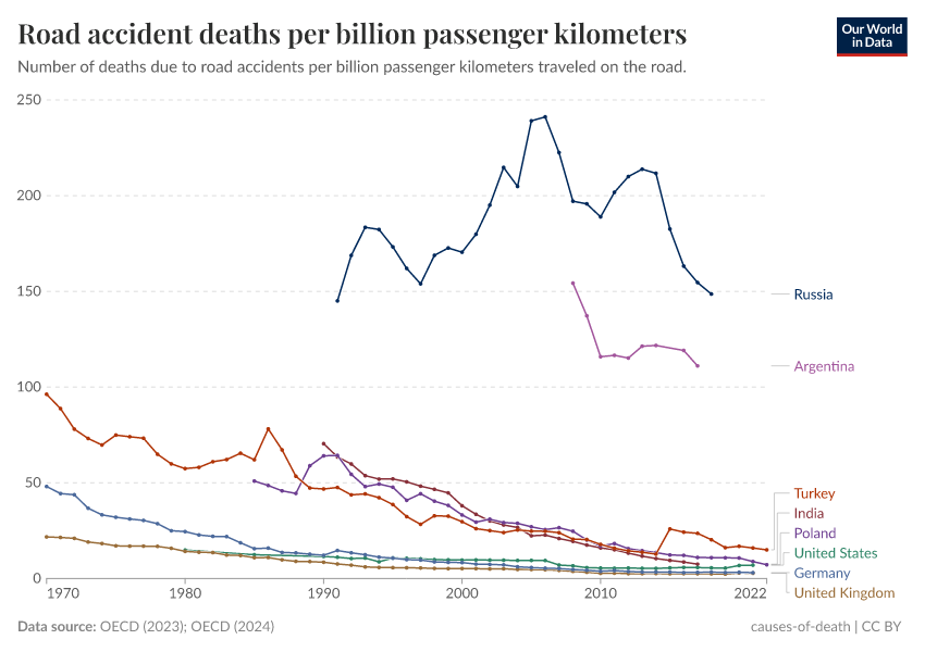 “Data Page: Road accident deaths per billion passenger kilometers”, part of the following publication: Hannah Ritchie and Max Roser (2021) - “Transport”. Data adapted from OECD. Retrieved from https://enhance-improve-who-empower.owid.pages.dev/grapher/road-accident-deaths-per-passenger-kilometers [online resource]How to cite this data