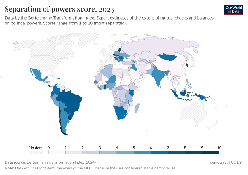 Bertelsmann Transformation Index (2024) – processed by Our World in Data. “Separation of powers score” [dataset]. Bertelsmann Transformation Index, “Bertelsmann Transformation Index, Scores” [original data]. Retrieved May 8, 2025 from https://enhance-improve-who-empower.owid.pages.dev/grapher/separation-of-powers-score-bti