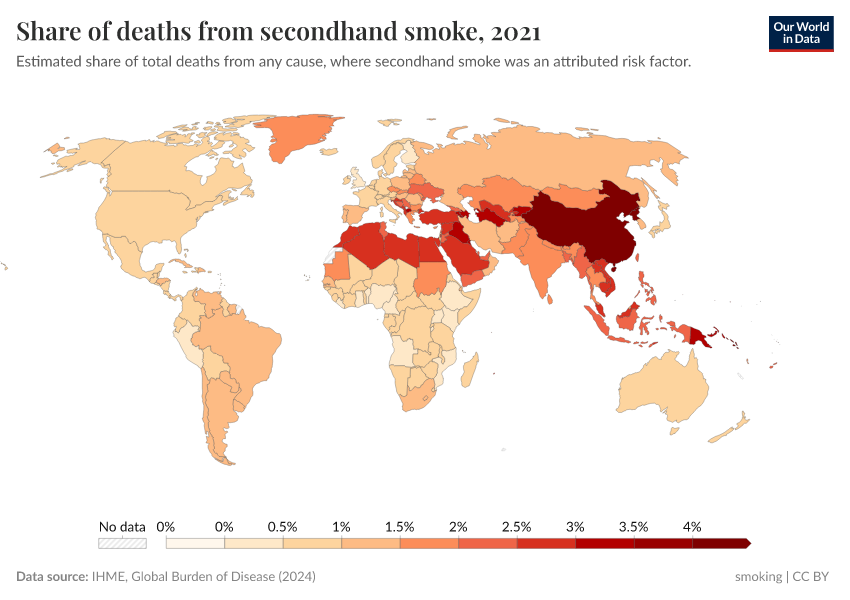 IHME, Global Burden of Disease (2024) – with minor processing by Our World in Data. “Share of deaths from secondhand smoke” [dataset]. IHME, Global Burden of Disease, “Global Burden of Disease - Risk Factors” [original data]. Retrieved May 8, 2025 from https://enhance-improve-who-empower.owid.pages.dev/grapher/share-deaths-secondhand-smoke