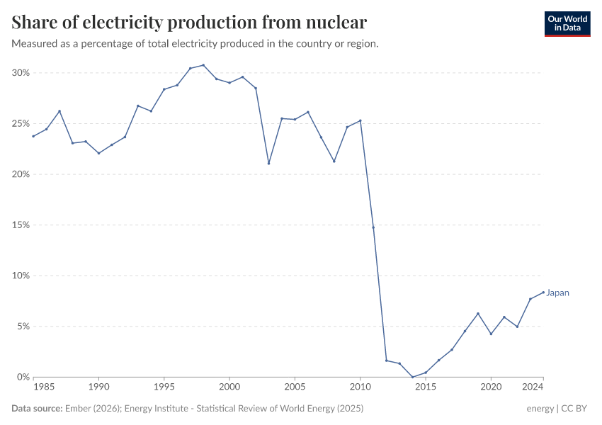 Ember (2024); Energy Institute - Statistical Review of World Energy (2024) – with major processing by Our World in Data. “Share of electricity generated by nuclear power – Ember and Energy Institute” [dataset]. Ember, “Yearly Electricity Data”; Energy Institute, “Statistical Review of World Energy” [original data]. Retrieved May 8, 2025 from https://enhance-improve-who-empower.owid.pages.dev/grapher/share-electricity-nuclear