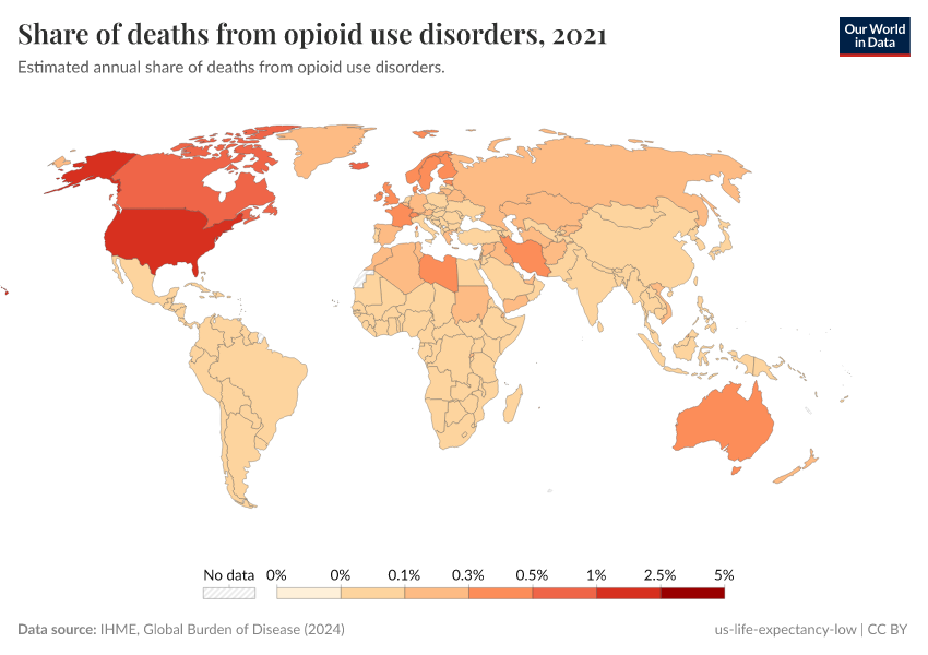IHME, Global Burden of Disease (2024) – with minor processing by Our World in Data. “Share of deaths from opioid use disorders” [dataset]. IHME, Global Burden of Disease, “Global Burden of Disease - Deaths and DALYs” [original data]. Retrieved May 8, 2025 from https://enhance-improve-who-empower.owid.pages.dev/grapher/share-of-deaths-from-opioid-overdoses