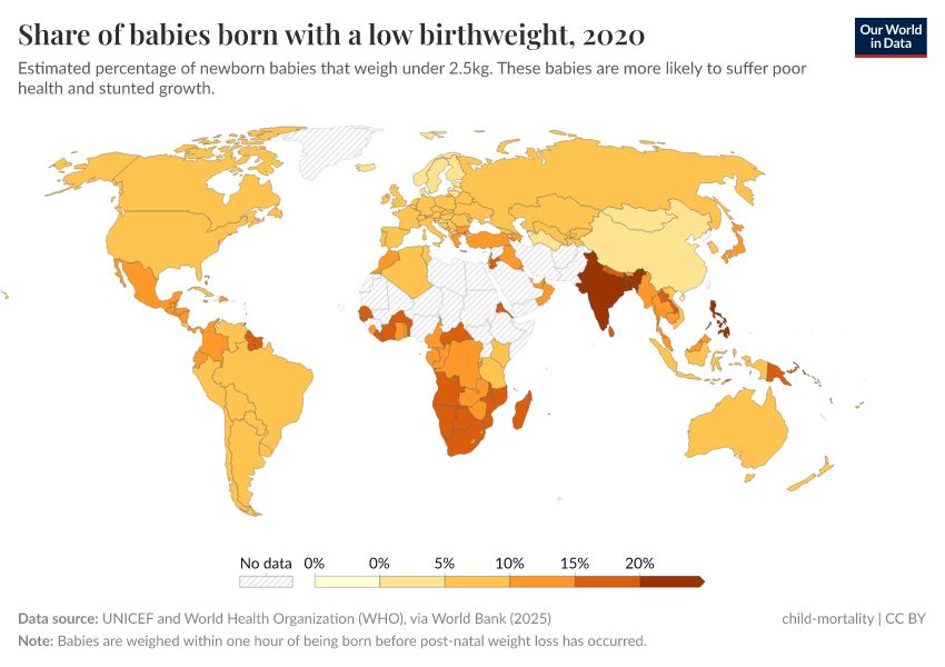 “Data Page: Share of babies born with a low birthweight”. Our World in Data (2025). Data adapted from UNICEF and World Health Organization (via World Bank). Retrieved from https://enhance-improve-who-empower.owid.pages.dev/grapher/share-of-low-birthweight-babies-born [online resource]How to cite this data