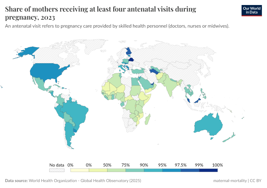 “Data Page: Share of mothers receiving at least four antenatal visits during pregnancy”. Our World in Data (2025). Data adapted from World Health Organization. Retrieved from https://enhance-improve-who-empower.owid.pages.dev/grapher/share-of-mothers-receiving-at-least-four-antenatal-visits-during-pregnancy [online resource]How to cite this data