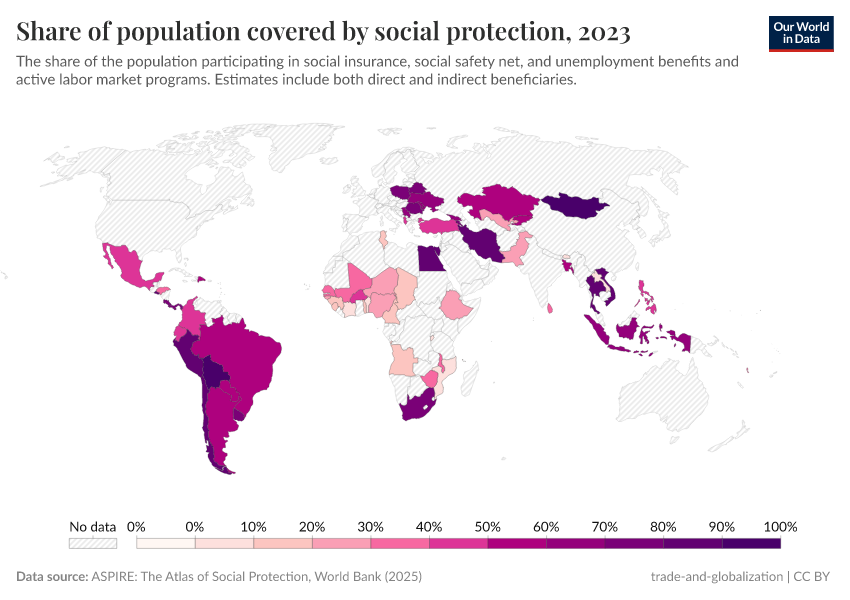 “Data Page: Share of population covered by social protection”. Our World in Data (2025). Data adapted from World Bank. Retrieved from https://enhance-improve-who-empower.owid.pages.dev/grapher/share-of-population-covered-by-social-protection [online resource]How to cite this data
