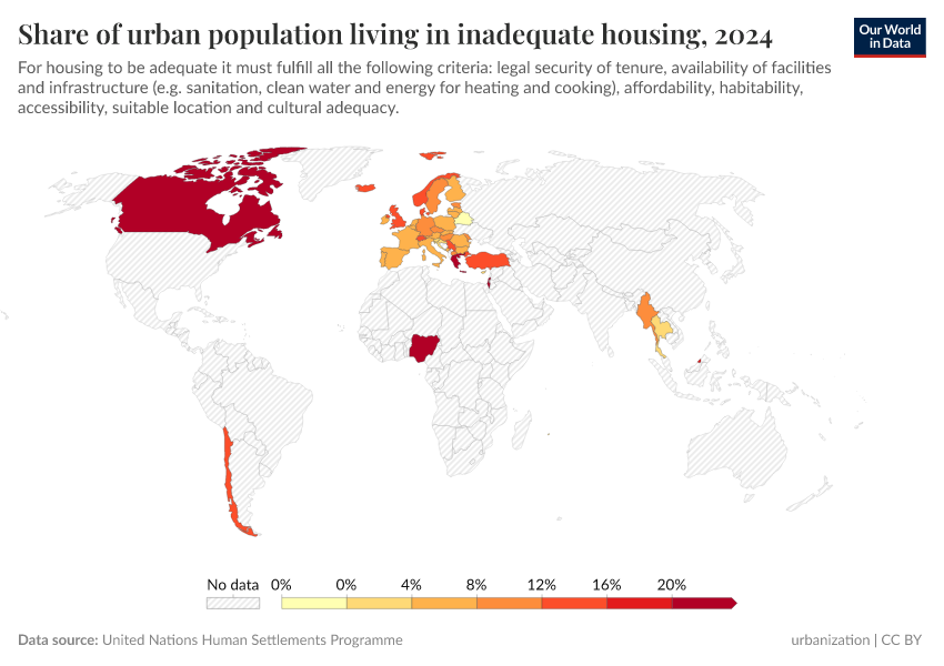 “Data Page: Share of urban population living in inadequate housing”. Our World in Data (2025). Data adapted from United Nations Human Settlements Programme. Retrieved from https://enhance-improve-who-empower.owid.pages.dev/grapher/share-of-urban-population-living-in-inadequate-housing [online resource]How to cite this data