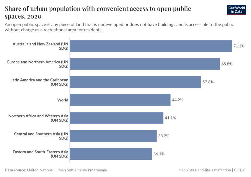United Nations Human Settlements Programme – processed by Our World in Data. “Share of urban population with convenient access to open public spaces” [dataset]. United Nations Human Settlements Programme, “Data from multiple sources” [original data]. Retrieved May 8, 2025 from https://enhance-improve-who-empower.owid.pages.dev/grapher/share-of-urban-population-with-convenient-access-to-open-public-spaces