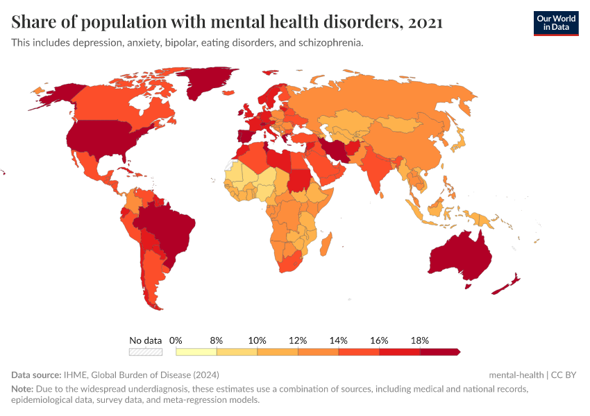 IHME, Global Burden of Disease (2024) – with major processing by Our World in Data. “Share of population with mental health disorders” [dataset]. IHME, Global Burden of Disease, “Global Burden of Disease - Prevalence and Incidence” [original data]. Retrieved May 8, 2025 from https://enhance-improve-who-empower.owid.pages.dev/grapher/share-with-mental-and-substance-disorders