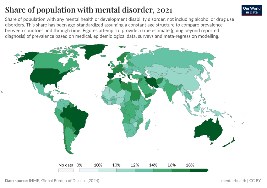 IHME, Global Burden of Disease (2024) – with major processing by Our World in Data. “Share of population with mental disorder” [dataset]. IHME, Global Burden of Disease, “Global Burden of Disease - Mental Health Prevalence” [original data]. Retrieved May 8, 2025 from https://enhance-improve-who-empower.owid.pages.dev/grapher/share-with-mental-health-or-development-disorder