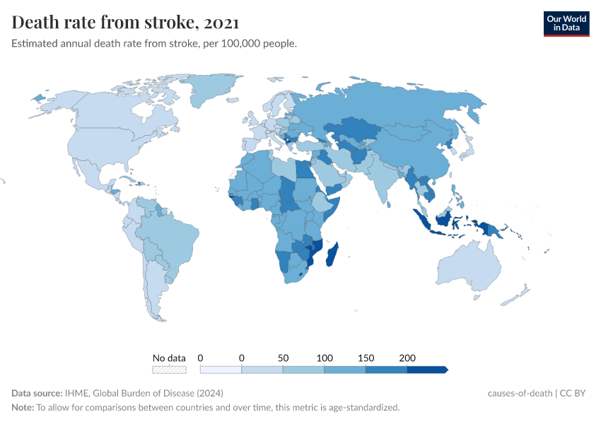 IHME, Global Burden of Disease (2024) – with minor processing by Our World in Data. “Death rate from stroke” [dataset]. IHME, Global Burden of Disease, “Global Burden of Disease - Deaths and DALYs” [original data]. Retrieved May 8, 2025 from https://enhance-improve-who-empower.owid.pages.dev/grapher/stroke-death-rates