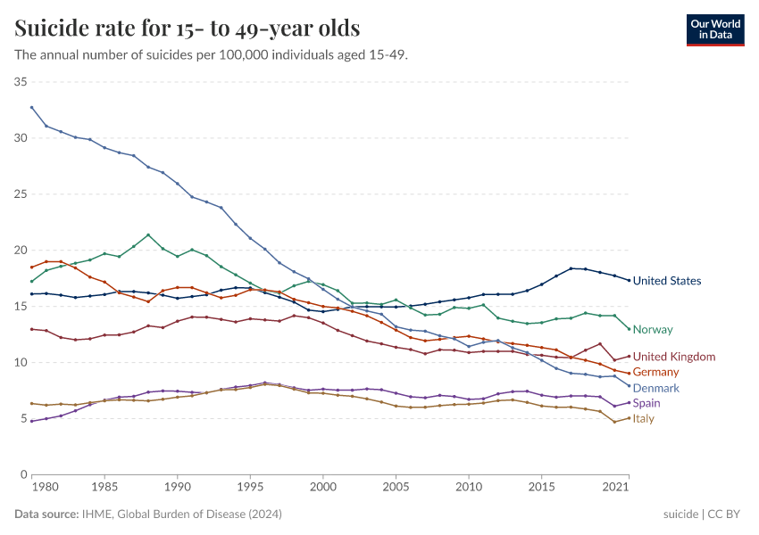 IHME, Global Burden of Disease (2024) – with minor processing by Our World in Data. “Suicide rate for 15- to 49-year olds” [dataset]. IHME, Global Burden of Disease, “Global Burden of Disease - Deaths and DALYs” [original data]. Retrieved May 8, 2025 from https://enhance-improve-who-empower.owid.pages.dev/grapher/suicide-rate-for-15--to-49-year-olds