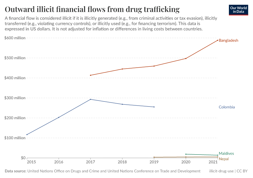 United Nations Office on Drugs and Crime and United Nations Conference on Trade and Development – processed by Our World in Data. “Outward illicit financial flows from drug trafficking” [dataset]. United Nations Office on Drugs and Crime and United Nations Conference on Trade and Development, “Data from multiple sources” [original data]. Retrieved May 8, 2025 from https://enhance-improve-who-empower.owid.pages.dev/grapher/total-outward-financial-flows-from-drug-trafficking