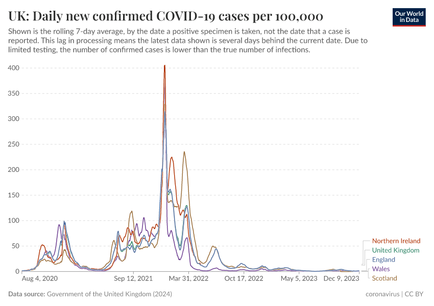 Government of the United Kingdom (2024) – with minor processing by Our World in Data. “UK: Daily new confirmed COVID-19 cases per 100,000” [dataset]. Government of the United Kingdom, “UKHSA data dashboard” [original data]. Retrieved May 8, 2025 from https://enhance-improve-who-empower.owid.pages.dev/grapher/uk-daily-covid-cases-7day-average