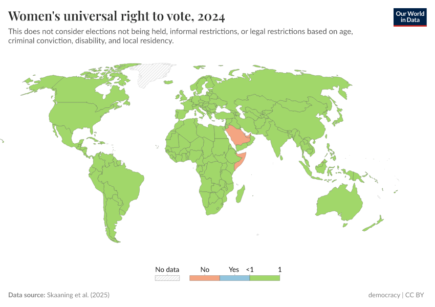 Skaaning et al. (2023) – processed by Our World in Data. “Women's universal right to vote” [dataset]. Skaaning et al., “Lexical Index of Electoral Democracy (LIED) v6.5” [original data]. Retrieved May 8, 2025 from https://enhance-improve-who-empower.owid.pages.dev/grapher/universal-suffrage-women-lexical