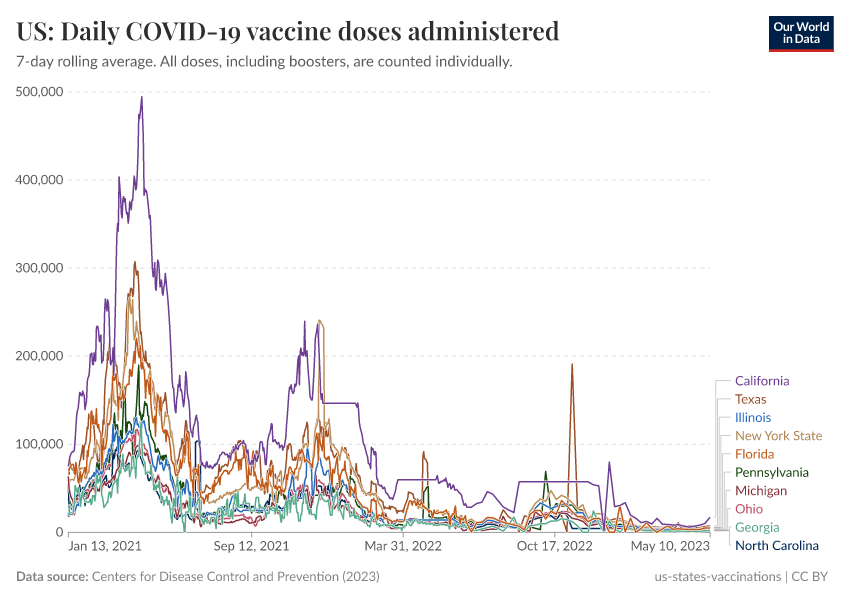 Centers for Disease Control and Prevention (2023) – processed by Our World in Data. “US: Daily COVID-19 vaccine doses administered” [dataset]. Centers for Disease Control and Prevention, “COVID-19, Vaccinations (United States)” [original data]. Retrieved May 8, 2025 from https://enhance-improve-who-empower.owid.pages.dev/grapher/us-daily-covid-vaccine-doses-administered