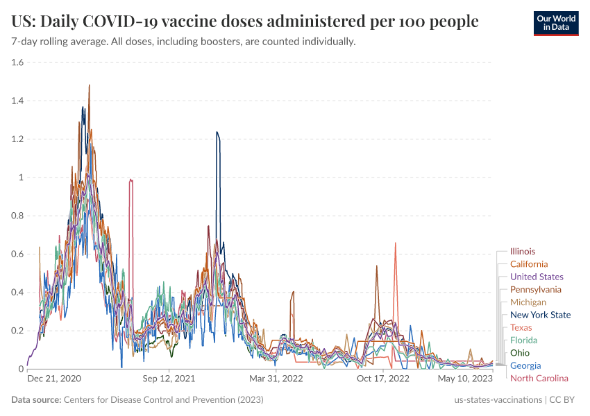 Centers for Disease Control and Prevention (2023) – processed by Our World in Data. “US: Daily COVID-19 vaccine doses administered per 100 people” [dataset]. Centers for Disease Control and Prevention, “COVID-19, Vaccinations (United States)” [original data]. Retrieved May 8, 2025 from https://enhance-improve-who-empower.owid.pages.dev/grapher/us-daily-covid-vaccine-doses-per-100