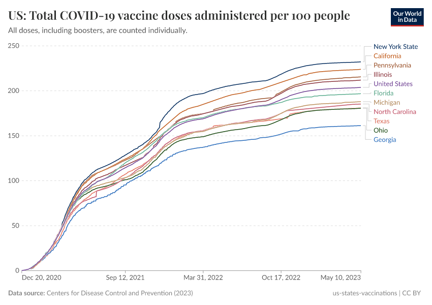 Centers for Disease Control and Prevention (2023) – processed by Our World in Data. “US: Total COVID-19 vaccine doses administered per 100 people” [dataset]. Centers for Disease Control and Prevention, “COVID-19, Vaccinations (United States)” [original data]. Retrieved May 8, 2025 from https://enhance-improve-who-empower.owid.pages.dev/grapher/us-state-covid-vaccines-per-100