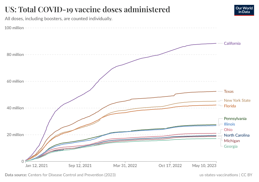 Centers for Disease Control and Prevention (2023) – processed by Our World in Data. “US: Total COVID-19 vaccine doses administered” [dataset]. Centers for Disease Control and Prevention, “COVID-19, Vaccinations (United States)” [original data]. Retrieved May 8, 2025 from https://enhance-improve-who-empower.owid.pages.dev/grapher/us-total-covid-19-vaccine-doses-administered