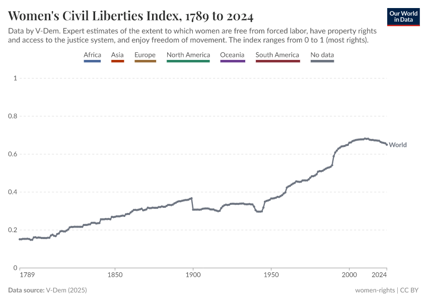 V-Dem (2025) – processed by Our World in Data. “Women's civil rights index – (central estimate)” [dataset]. V-Dem, “Democracy report v15” [original data]. Retrieved May 8, 2025 from https://enhance-improve-who-empower.owid.pages.dev/grapher/women-civil-liberties-index